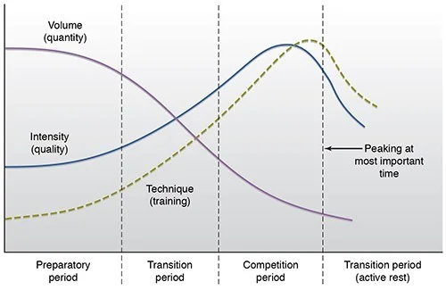 Matveyev's Classic Periodization Model - While this graph presents an example of the manipulation of volume and intensity of training, many modern day coaches agree that it's too simplisitc to reflect the training of sport today.